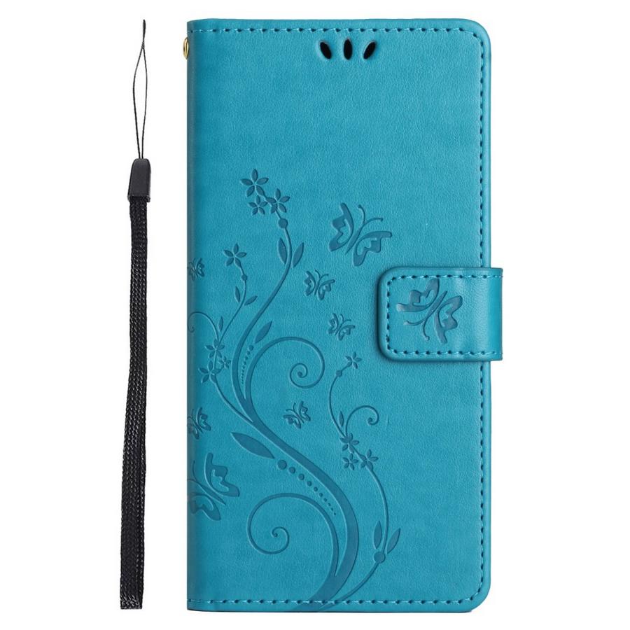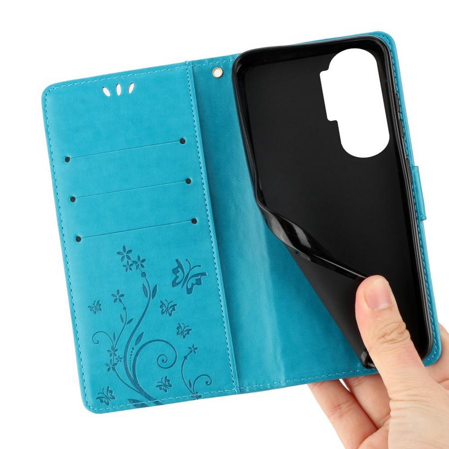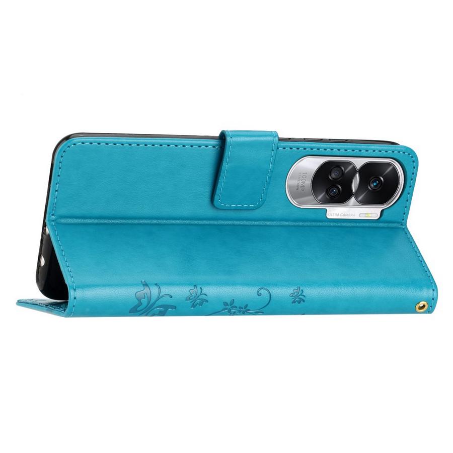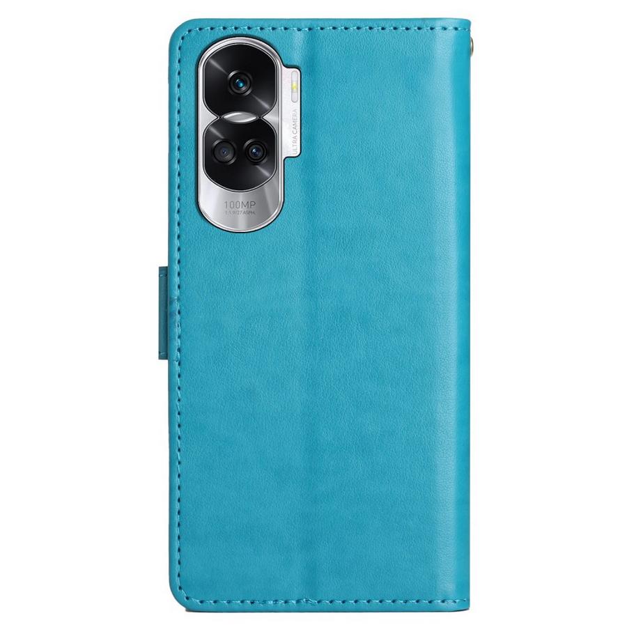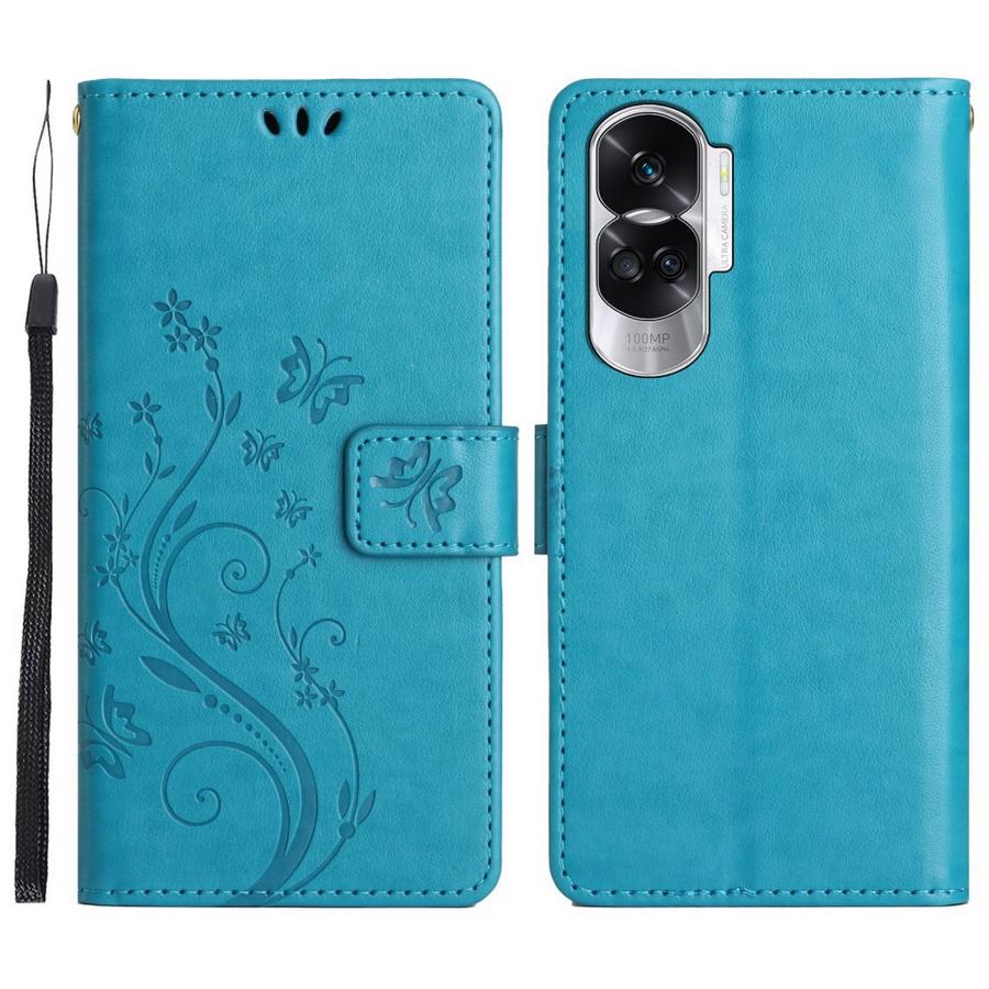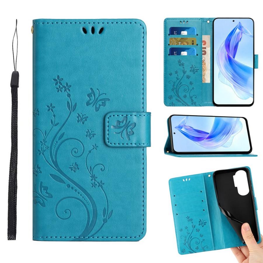 Upea petroolinsininen kotelo on painokuvioitu perhosilla ja kukkasilla, särkymiseltä suojaava viehättävä malli Honor 90 Lite 5G puhelimelle.