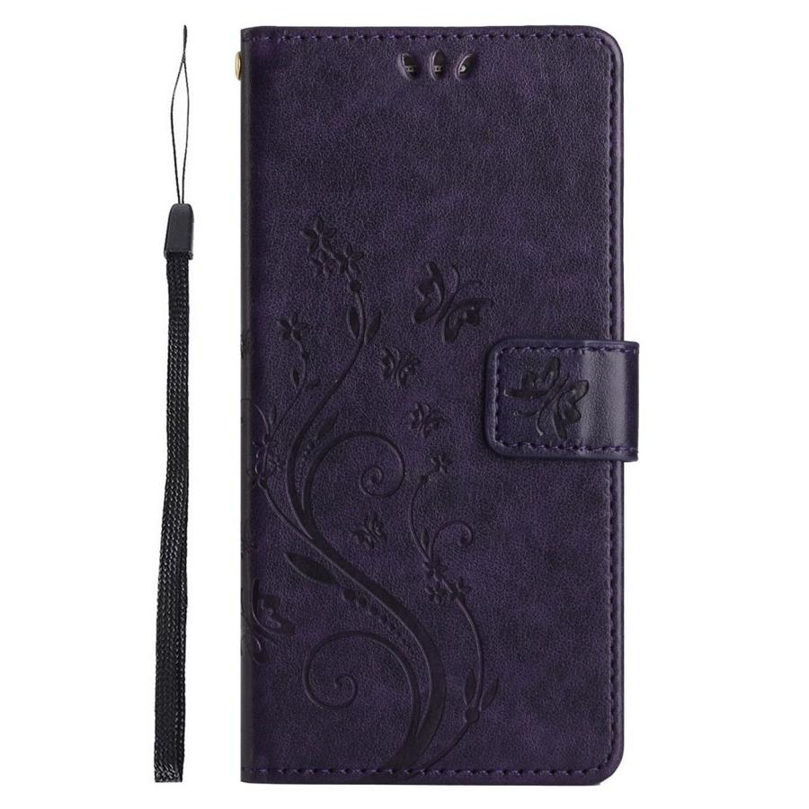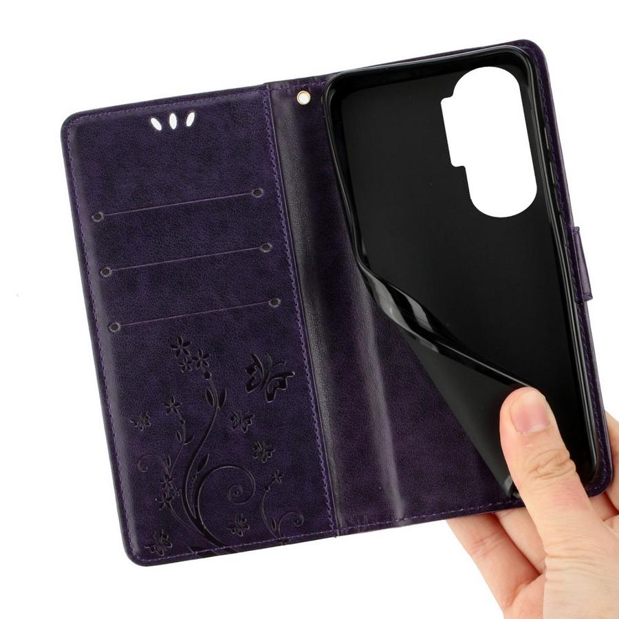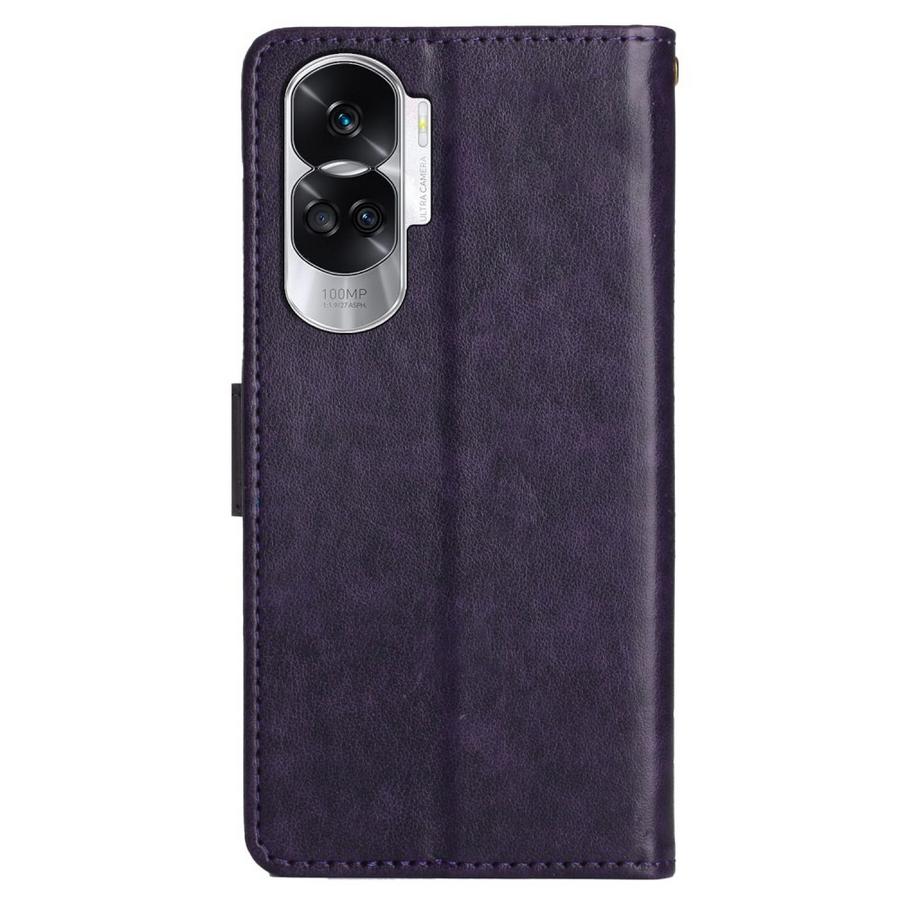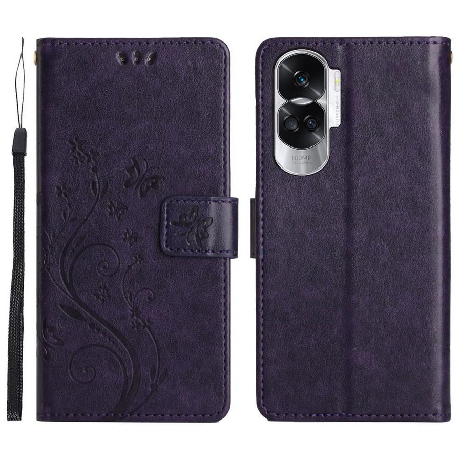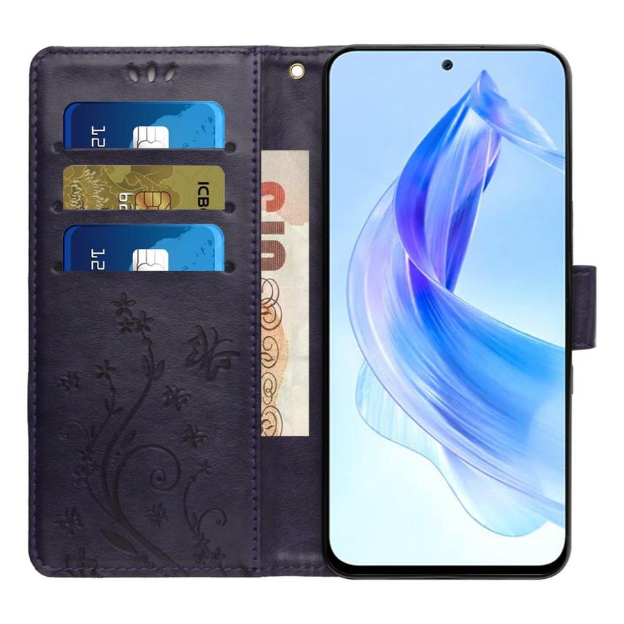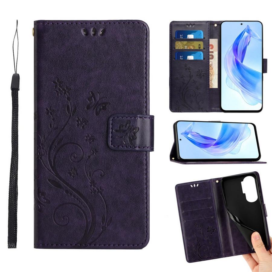 Perhosilla ja kukilla painokuvioitu tyylikkään tummanvioletin värinen kotelo, suojaksi Honor 90 Lite 5G puhelimelle rikkoutumiselta.