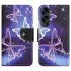 Honor 90 Lite 5G puhelimen kauttaaltaan turvaavassa, tumman sävyisessä kotelossa on kuvioituna perhosia tähtien tuikkeessa.Kaunis lompakkomallinen kotelo on suoja, jolla saa estettyä naarmut ja särkyminen.