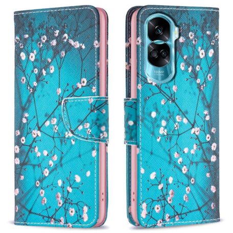 Sinisävyisiä kansia koristavat kukkivat oksat, Honor 90 Lite 5G puhelinmallin kattavasti rikkoutumiselta suojaava kotelo.