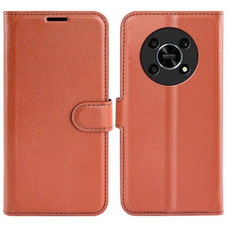 Vahingoilta ja naarmuilta suojaava lompakkomallinen kotelo Honor Magic4 Lite 5G puhelimen turvaksi, värityksenä lämmin ruskean sävy.