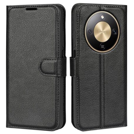 Honor Magic8 Lite 5G -älypuhelimelle rikkoutumiselta suojaava, käytännöllinen ja aina edustavan mustan värinen lompakkokotelo.