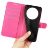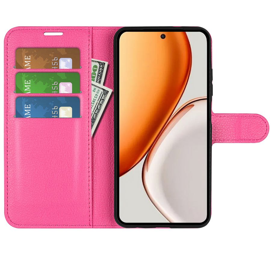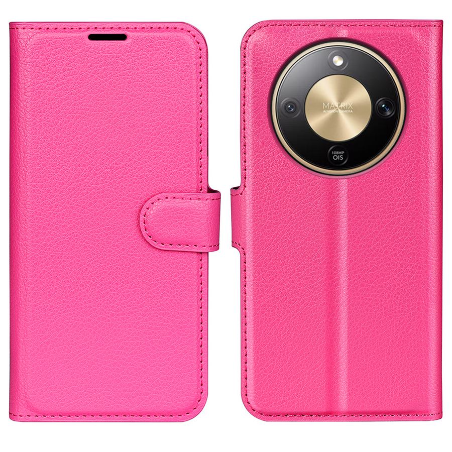 Napakka lompakkomallinen kotelo piristävän pinkin värisillä kansilla turvaa Honor Magic8 Lite 5G -älypuhelimen vahingoittumiselta.