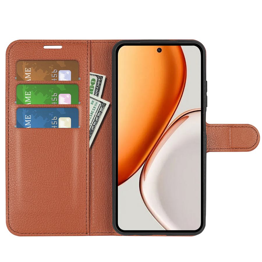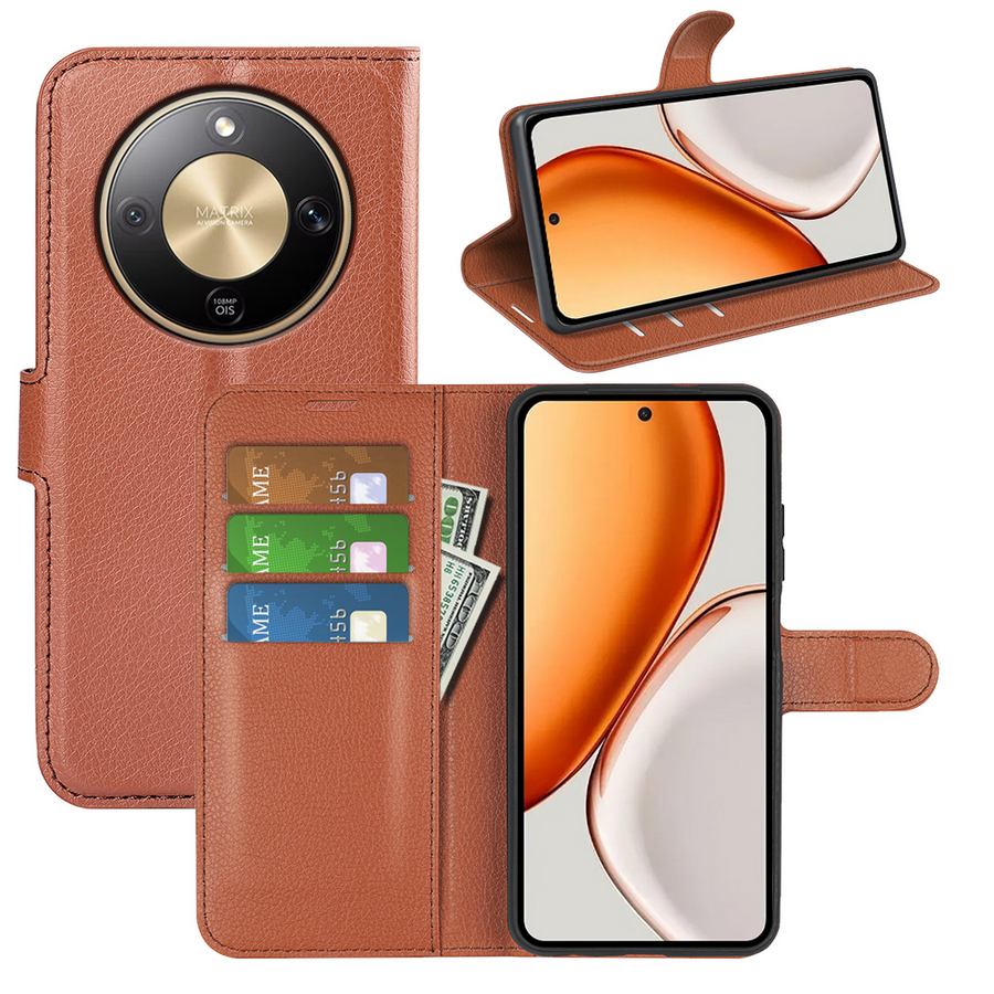 Honor Magic8 Lite 5G -puhelimelle sopiva, pehmeän ruskean sävyinen lompakkokotelo on käytännöllinen ja kattava vahingoittumisen suoja.