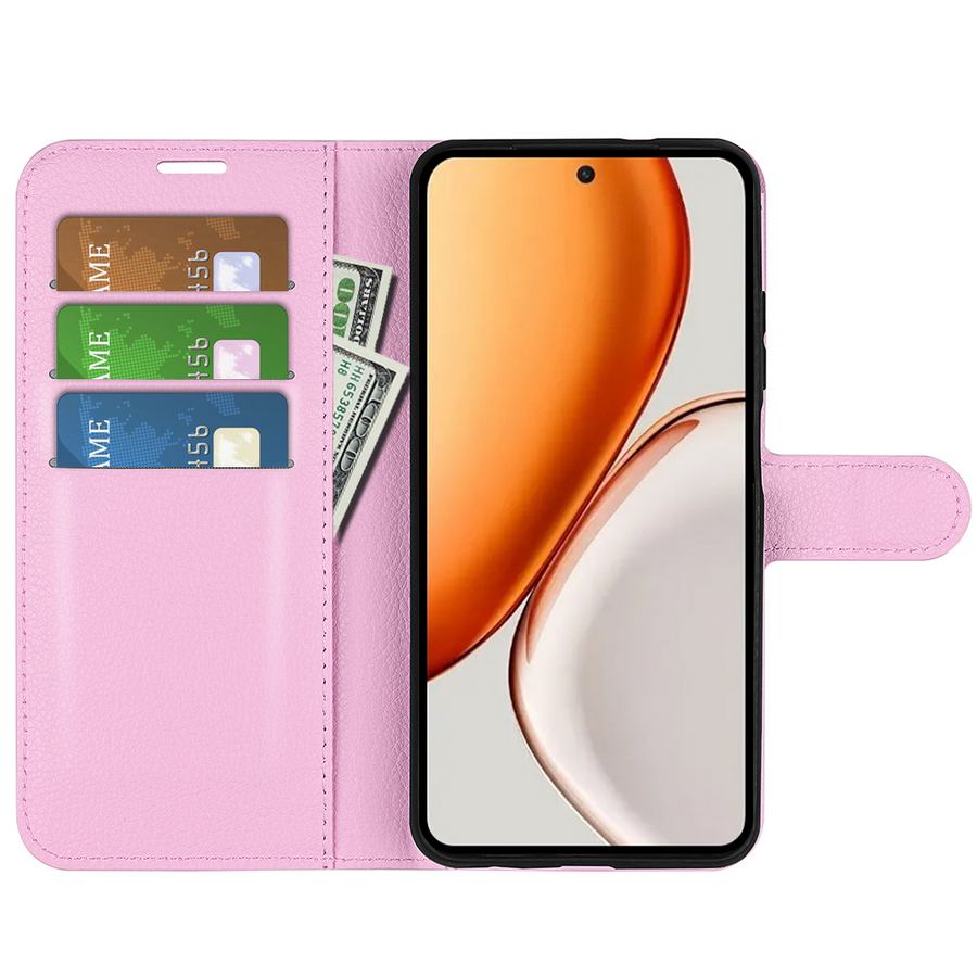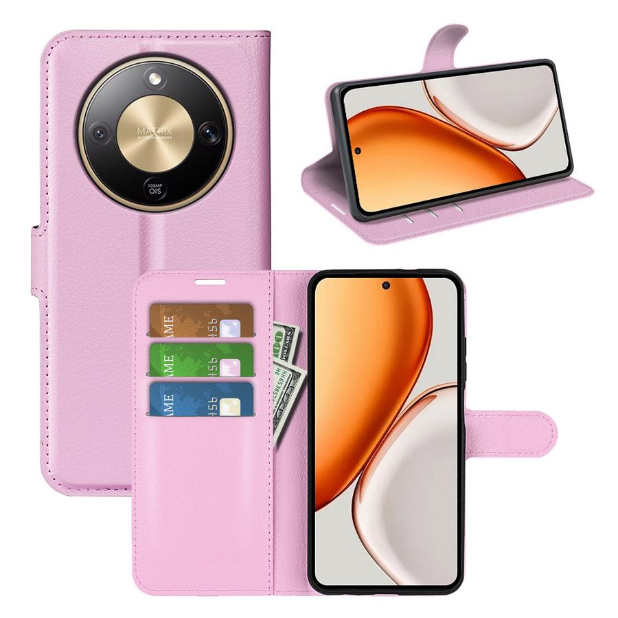 Lompakkokotelo soman vaaleanpunaisin kansin, Honor Magic8 Lite 5G -puhelimelle käytännöllinen ja napakka rikkoutumisen suoja.