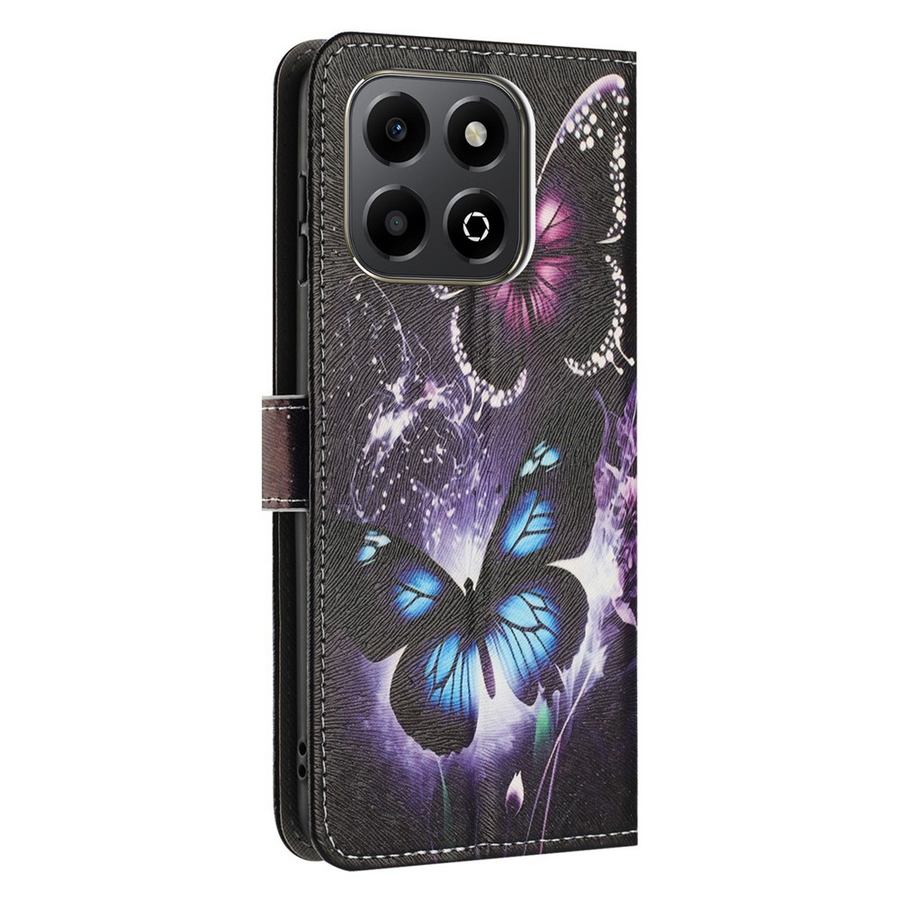 Honor X6a / Honor X6b puhelimia suojaava lompakkokotelo, jonka tummissa kansissa on upeat ja kauniin väriset perhoskuvioinnit.