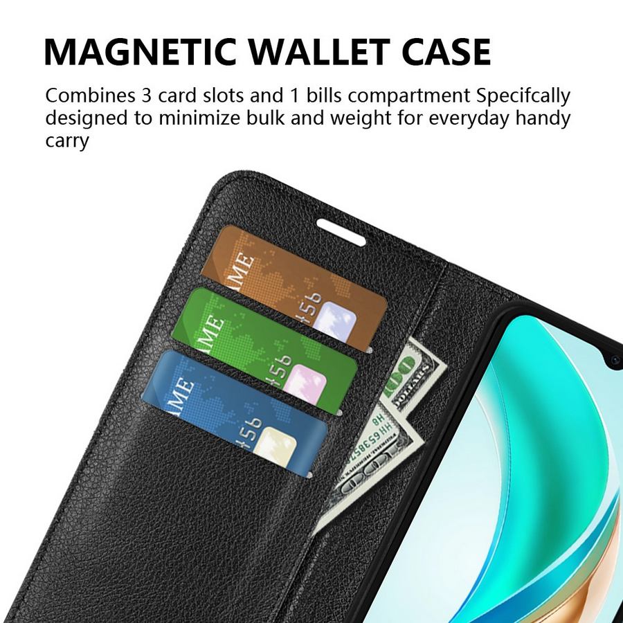 Tyylikkäästi mustakantinen lompakkokotelo suojaa Honor X6b -älypuhelimen osumilta ja putoamisten tuottamilta vahingoilta.