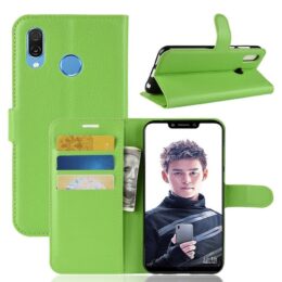 Suomalaisesta puhelimenkuoret.fi verkkokaupasta tilaat hintaan 13.95 euroa vihreän Huawei Honor Play älypuhelimeen sopivan lompakkokotelon.