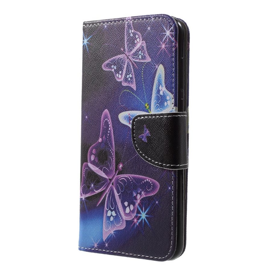 Huawei Honor Play puhelimeen sopivassa perhonen 2 lompakkokotelossa on kaksi korttipaikkaa, tasku, jalusta-toiminto ja magneettiläpällä sulkeutuva kansi.