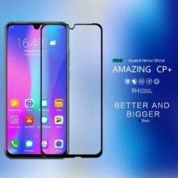 Suojaa Huawei P Smart (2019) puhelimen koko näytönala tehokkaasti Nillkin CP+ panssarilasi näytönsuojalla, jossa on mustat kehykset.