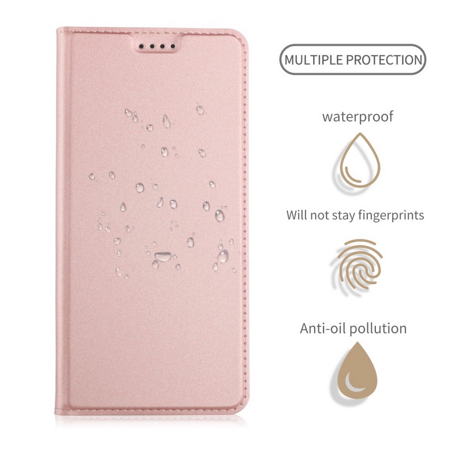 Kotelossa on kolme korttipaikkaa, kuittitasku, jalusta-ominaisuus ja magneetilla sulkeutuva kansi.