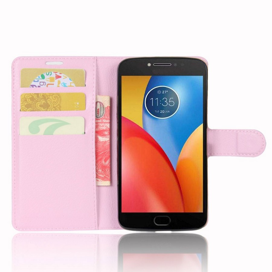 Lenovo Moto E4 Plus / Motorola Moto E4 Plus puhelimeen sopivassa vaaleanpunaisessa lompakkokotelossa on kolme korttipaikkaa ja kuittitasku.