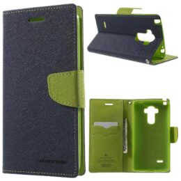 LG G4 Stylus puhelimeen sopiva Fancy lompakko suojakotelo on sininen ulkoa ja vihreä sisältä.