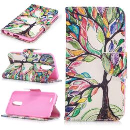 Suojaa LG K10 (2017) älypuhelin kolhuilta ja naarmuilta lompakko suojakotelolla, jossa on kuviona värikäs puu.