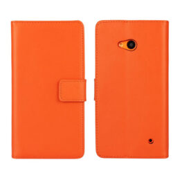 Tyylikäs aidosta nahasta valmistettu oranssi lompakkokotelo auttaa suojaamaan Microsoft Lumia 640 LTE puhelinta putoamisilta ja kolhuilta.
