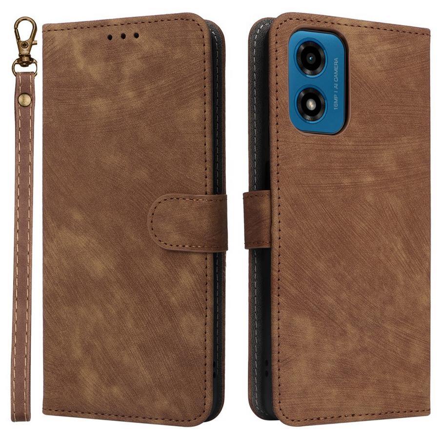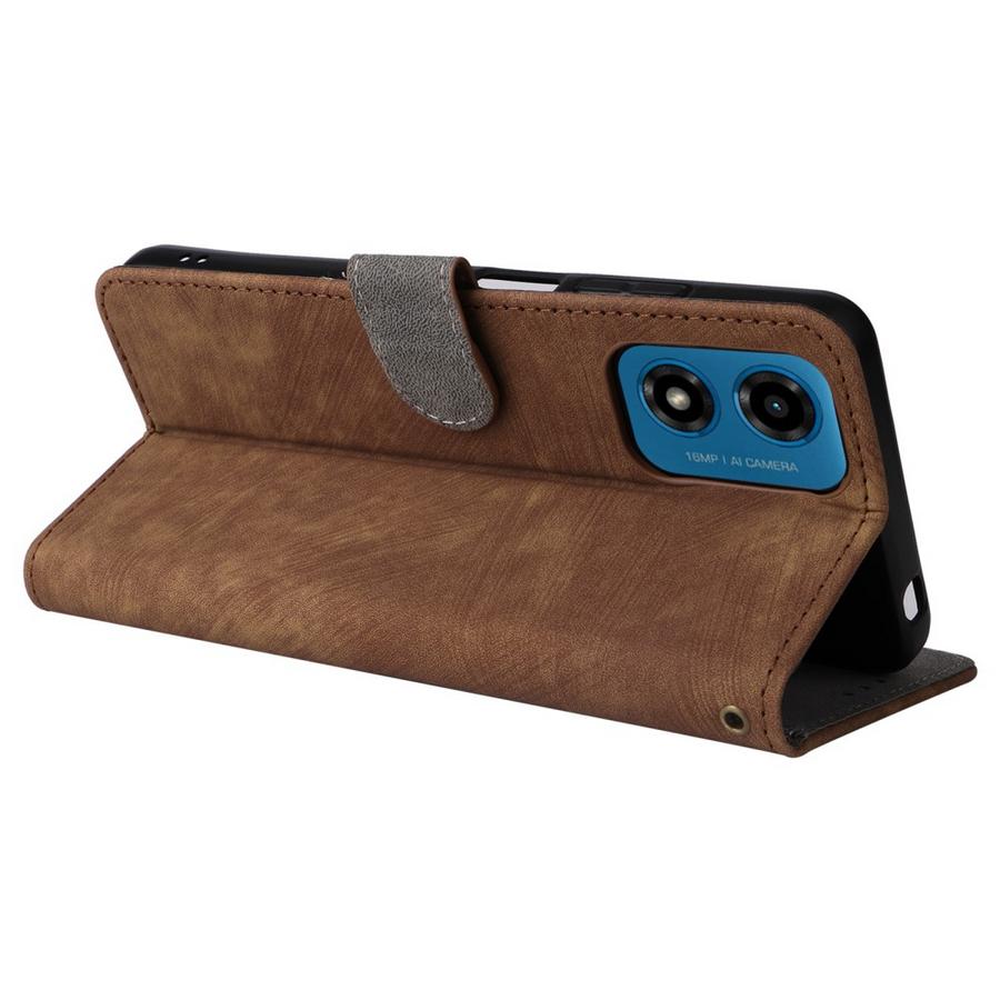 Erinomainen suojaus särkymiseltä Motorola Moto E14 älypuhelimelle tyylikkäällä ja luonnollisen sävyisellä ruskealla lompakkokotelolla.