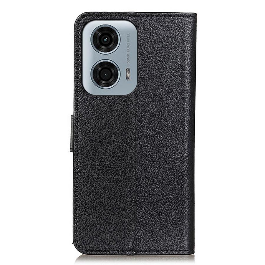 Lompakkomallin kotelo mustilla kansilla on käytännöllinen ja napakka ja tehokas suoja Motorola Moto G04 / G24 / G24 Power puhelimille.
