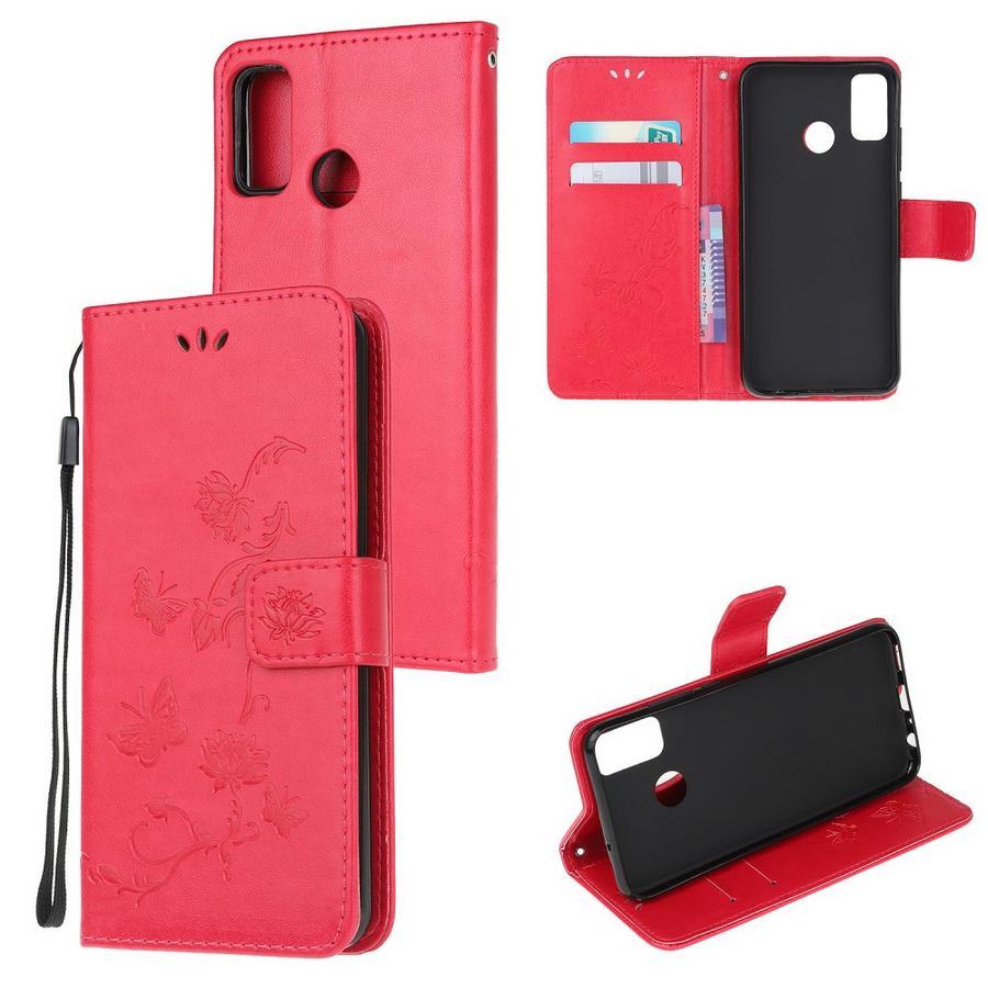 Motorola Moto G50 5G puhelimen suojaamiseen aivan ihana pinkki kotelo, jonka kansissa on somisteena painokuvioituja perhosia ja kukkia.