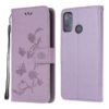 Hempeä vaalenvioletti kotelo, jonka somistuksena on painettuja kukkia ja perhosia. Pätevä ja napakka suoja Motorola Moto G50 5G puhelimelle.