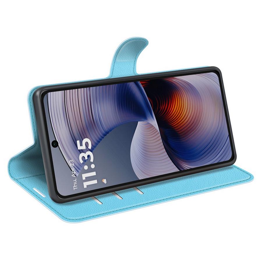 Vaaleasävyisen sininen lompakkokotelo suojaa osumien aiheuttamilta vahingoilta ja sopii Motorola Moto G55 5G puhelimelle.