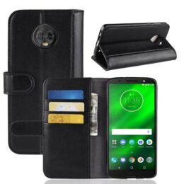 Mustalla aidosta nahasta valmistetulla lompakkokotelolla suojaat Motorola Moto G6 Plus älypuhelimen iskuilta, kolhuilta ja putoamisilta tyylillä.