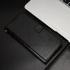 Ajattoman musta lompakkomallinen kotelo Motorola Moto G75 5G puhelimelle, jotta se pysyy turvallisesti suojattuna naarmuilta ja iskuilta.