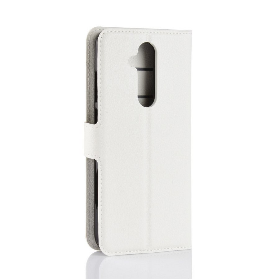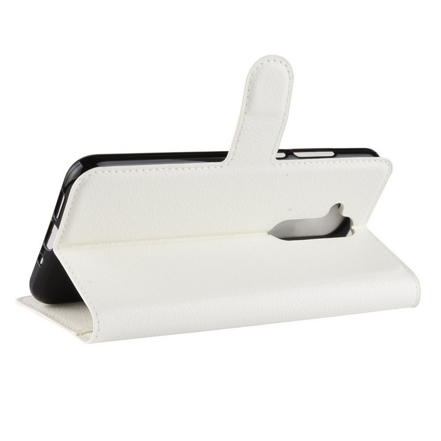 Nokia 8.1 valkoisessa PU-nahkaisessa lompakkokotelossa on tasku, jalusta-toiminto, kolme luottokorttipaikkaa ja magneettiläpällä suljettava kansi.
