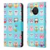 Turkoosin sävyisiin kansiin on kuvioitu iloisen veikeitä ja värikkäitä pöllöhahmoja, rikkoutumiselta suojaava kotelo Nokia X10 5G puhelimelle.