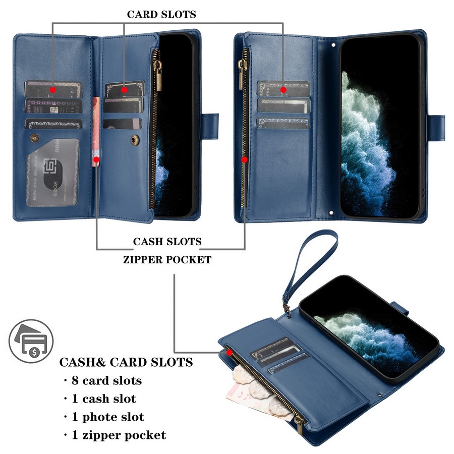 OnePlus 15 -älypuhelimelle sopiva, naarmuuntumiselta sekä vaurioilta suojaava kauniin tummansininen lompakkokotelo.