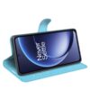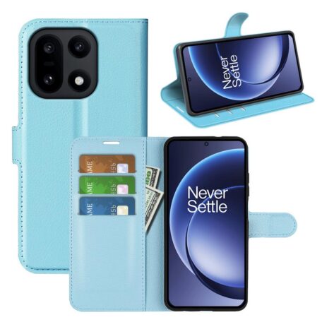 Käytännöllinen, lompakkomallinen kotelo vaaleasävyisen sinisillä kansilla suojaa pätevästi OnePlus 15 -älypuhelimen osumilta.