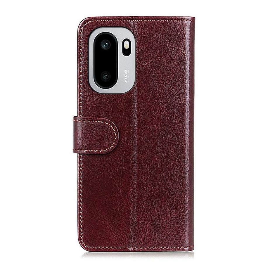 OnePlus 15R puhelimelle sopiva vaurioitumiselta suojaava lompakkomallinen kotelo, tyylikkäin kiiltävän ruskein kansin.