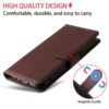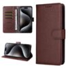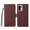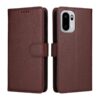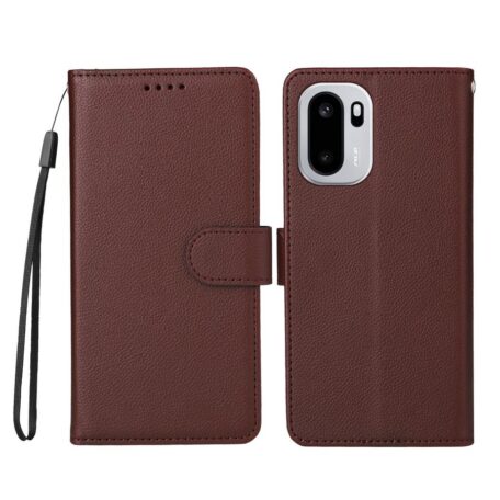 Tummaan ruskeaan sävyyn puettu lompakkokotelo OnePlus 15R -älypuhelimen suojaamiseen kolahduksilta ja pintojen naarmuilta.