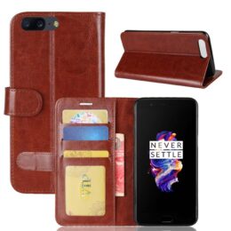 Suojaa OnePlus 5 älypuhelin tyylillä ruskealla lompakko suojakotelolla, jossa on kolme korttipaikkaa.
