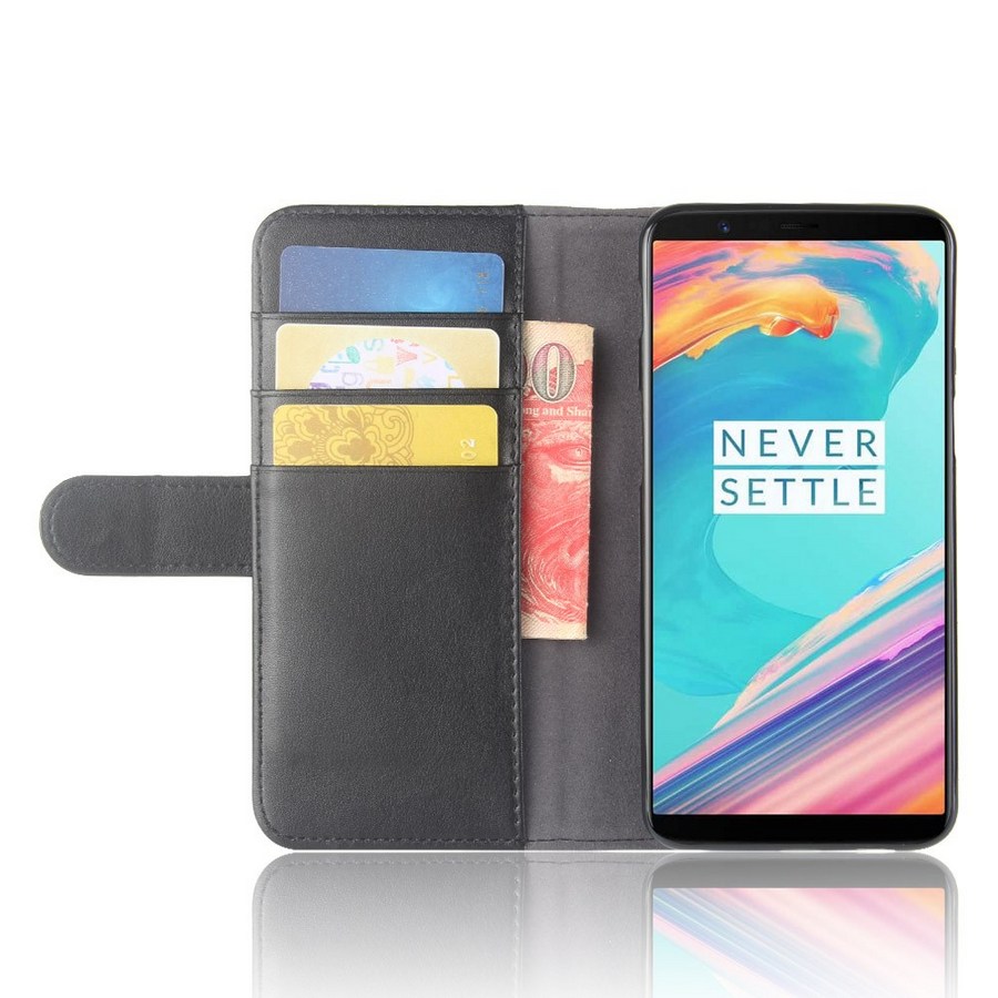 Suojaa OnePlus 5T älypuhelin iskuilta ja kolhuilta mustalla tukevalla lompakkokotelolla, joka on valmistettu aidosta nahasta.