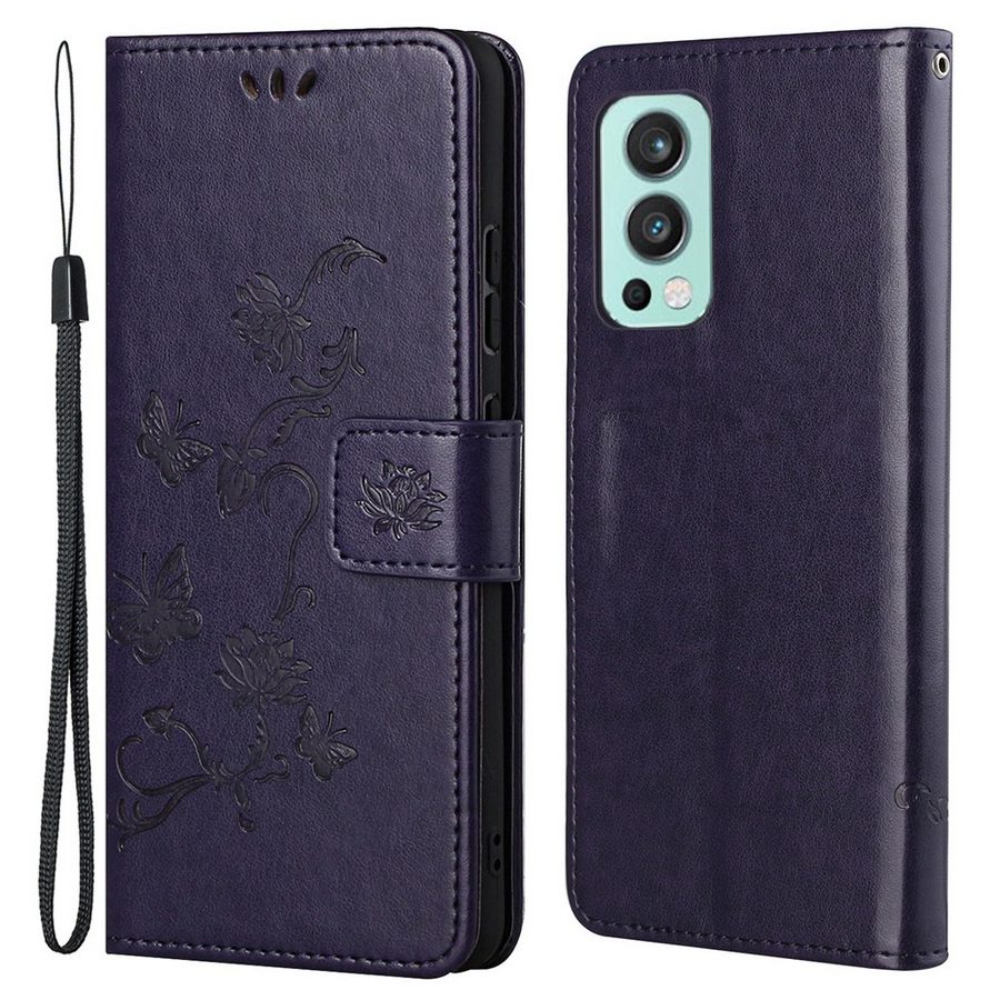 Kauniisti perhosilla ja kukilla painokuvioitu tummanvioletti kotelo, joka suojaa OnePlus Nord 2 5G puhelinta säröytymiseltä.