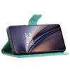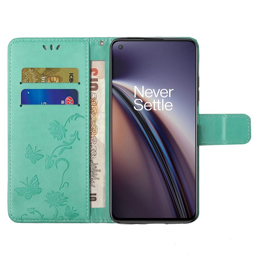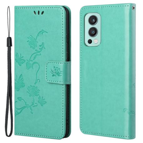 OnePlus Nord 2 5G puhelimelle soveltuva suojaava lompakkokotelo raikkaassa turkoosin värissä, somisteena painettuja kukkia ja perhosia.