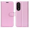 Särkymiseltä ja naarmuilta napakasti suojaava lompakkokotelo OnePlus Nord 5 5G puhelinmallille, kansissa suloisen vaaleanpunainen väritys.