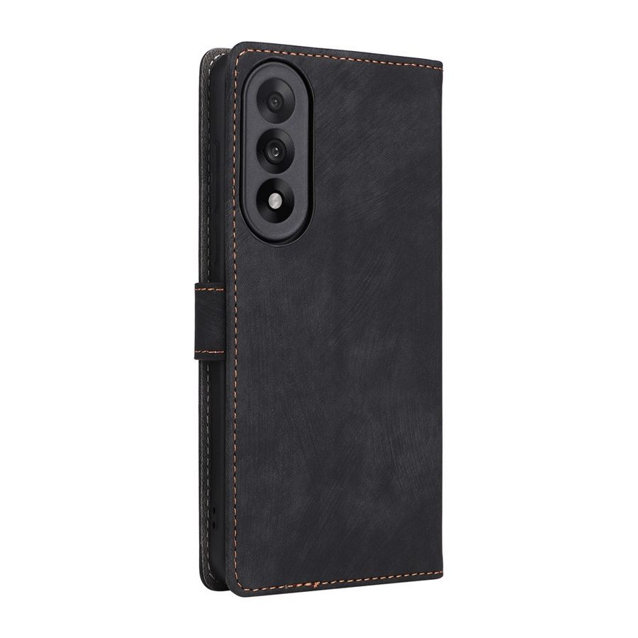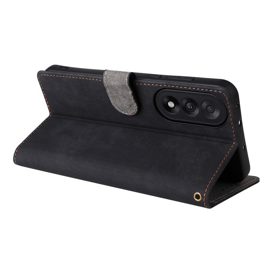 Mustassa lompakkomallisessa kotelossa OnePlus Nord 5 5G puhelinta sekä maksuvälineitä on turvallista käyttää ja kuljettaa matkassa.