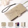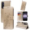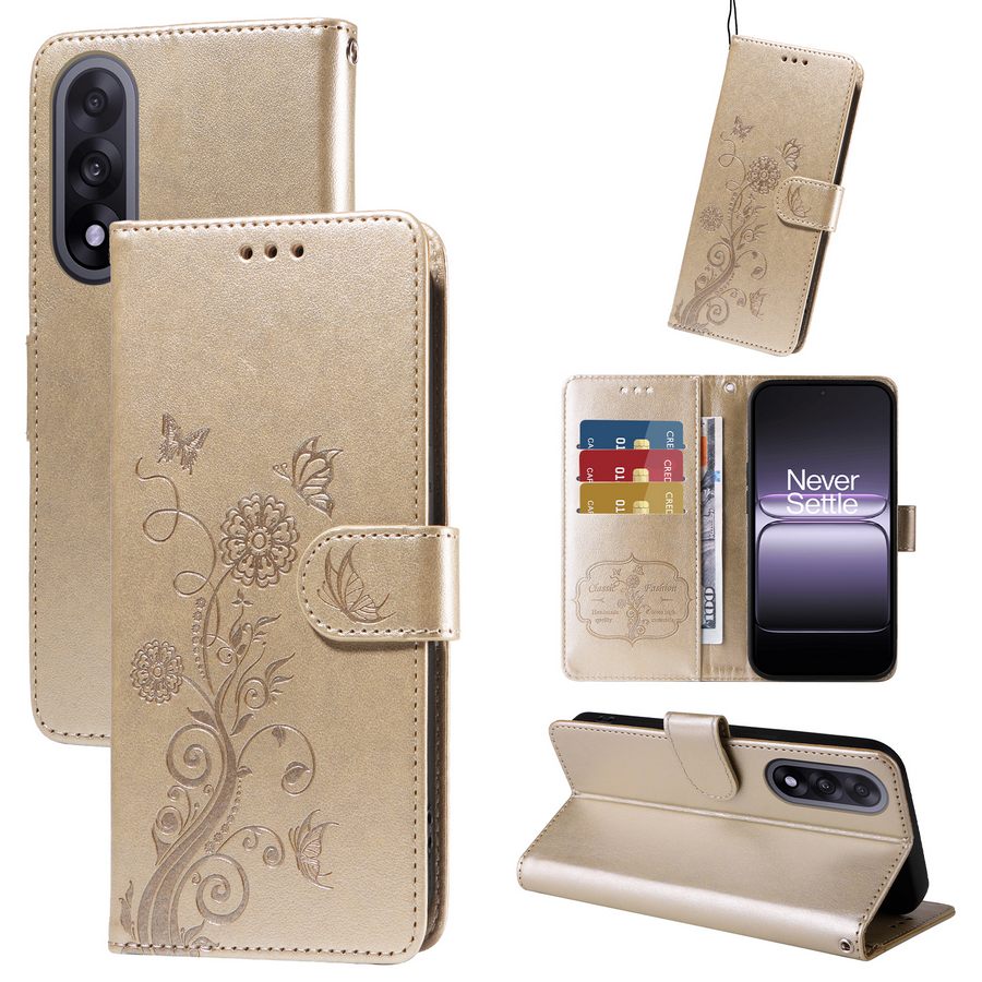 Ihanasti perhosin ja kukkaköynnöksellä painokuvioitu, kullankiiltävä lompakkokotelo OnePlus Nord 5 5G puhelinmallia suojaamaan.