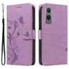 Hempeän vaalea violetin sävy ja ihastuttava perhos- ja kukkakuviointi, mitä kaunein OnePlus Nord CE 4 Lite 5G puhelinta suojaava kotelo.