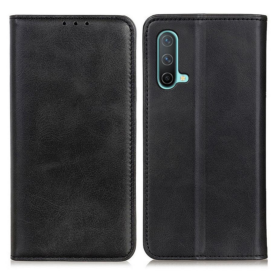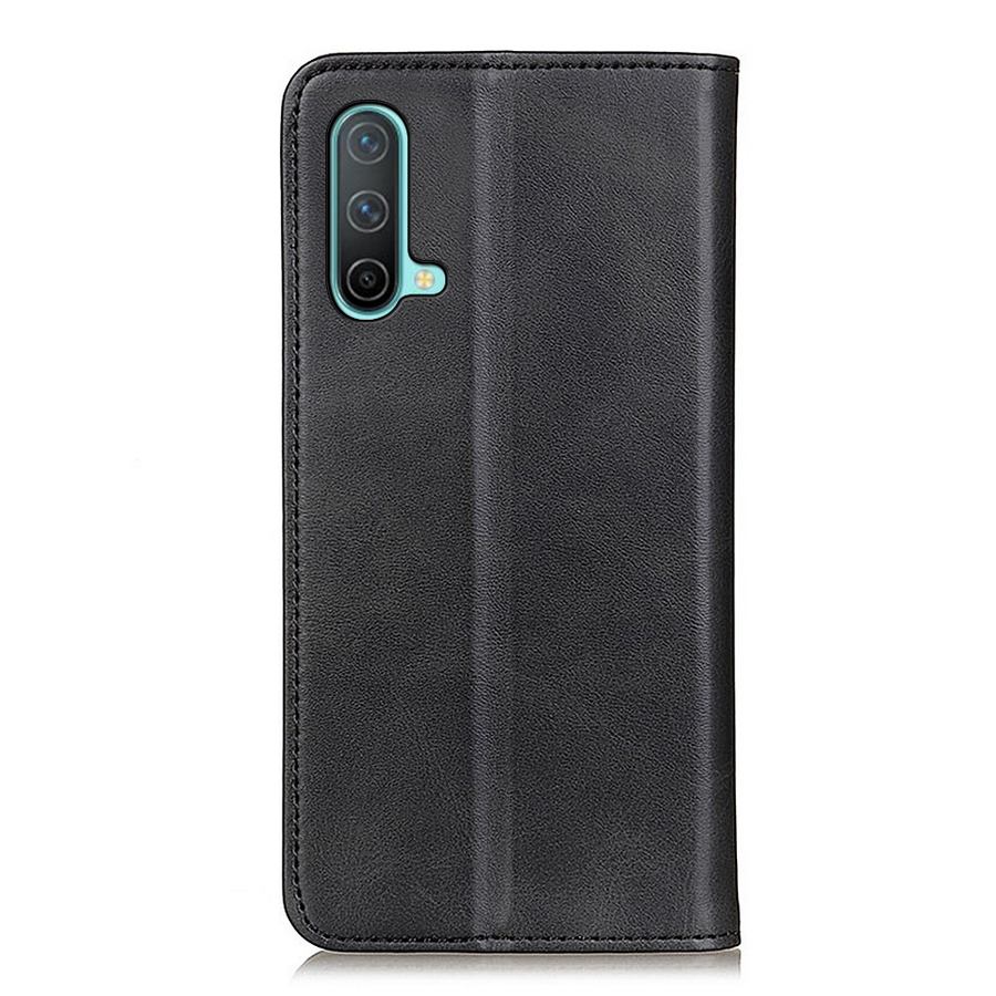 Tyylikkäästi nahkakuvioidut tummat kannet suojaavat OnePlus Nord CE 5G puhelinta rikkouttumiselta ja kotelon muotoilu on kauniin selkeä.