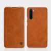 Pehmeän ruskean värinen nahkakuvioitu Nillkin Qin -kotelo pitää OnePlus Nord älypuhelimen turvassa säröiltä ja naarmuilta.