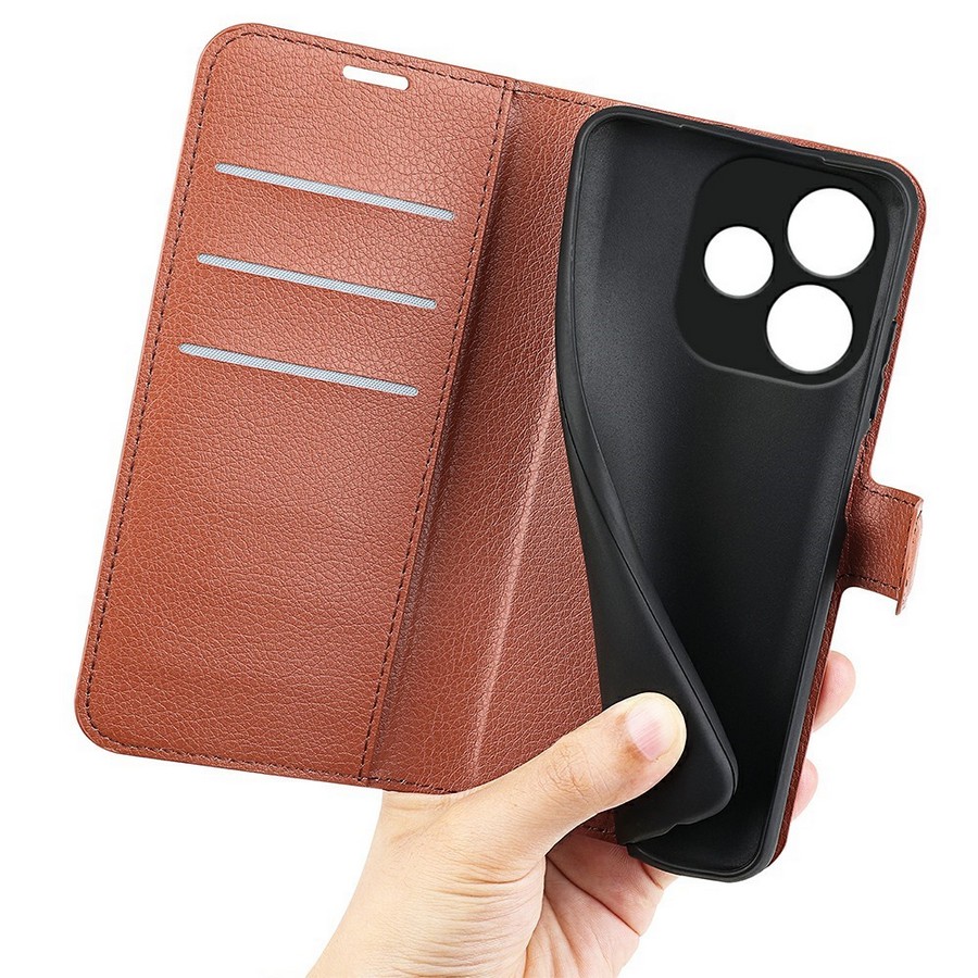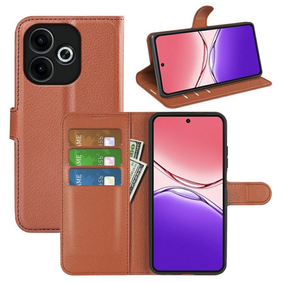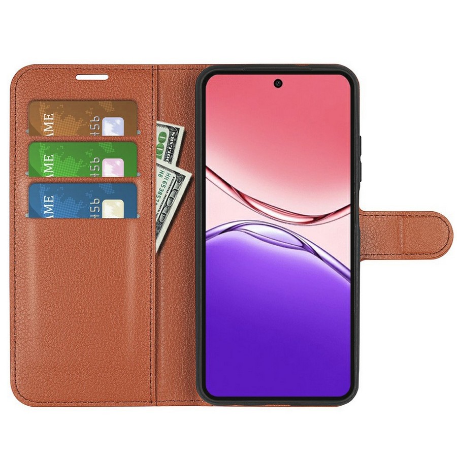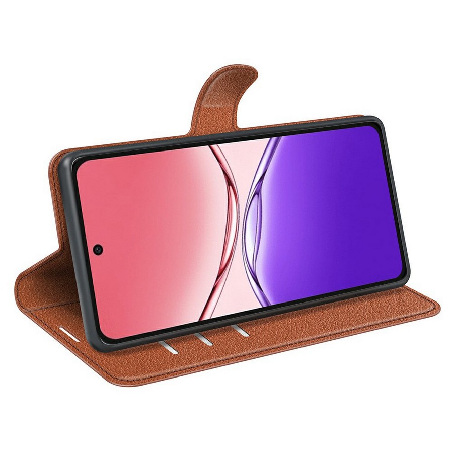 Oppo A5 Pro 5G -puhelimelle sopiva, pehmeän ruskean sävyinen lompakkokotelo on käytännöllinen ja kattava vahingoittumisen suoja.