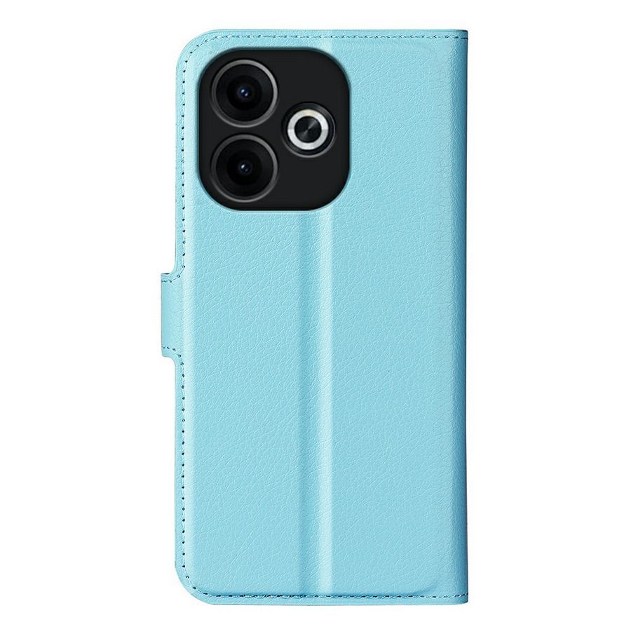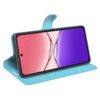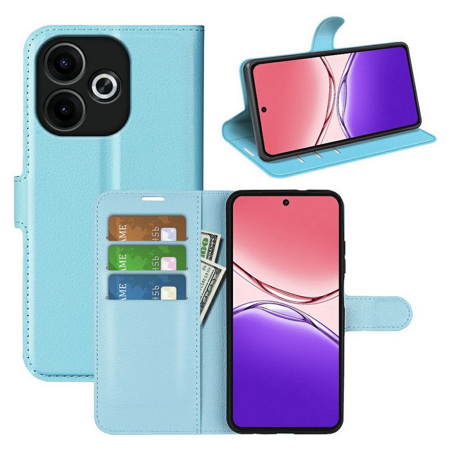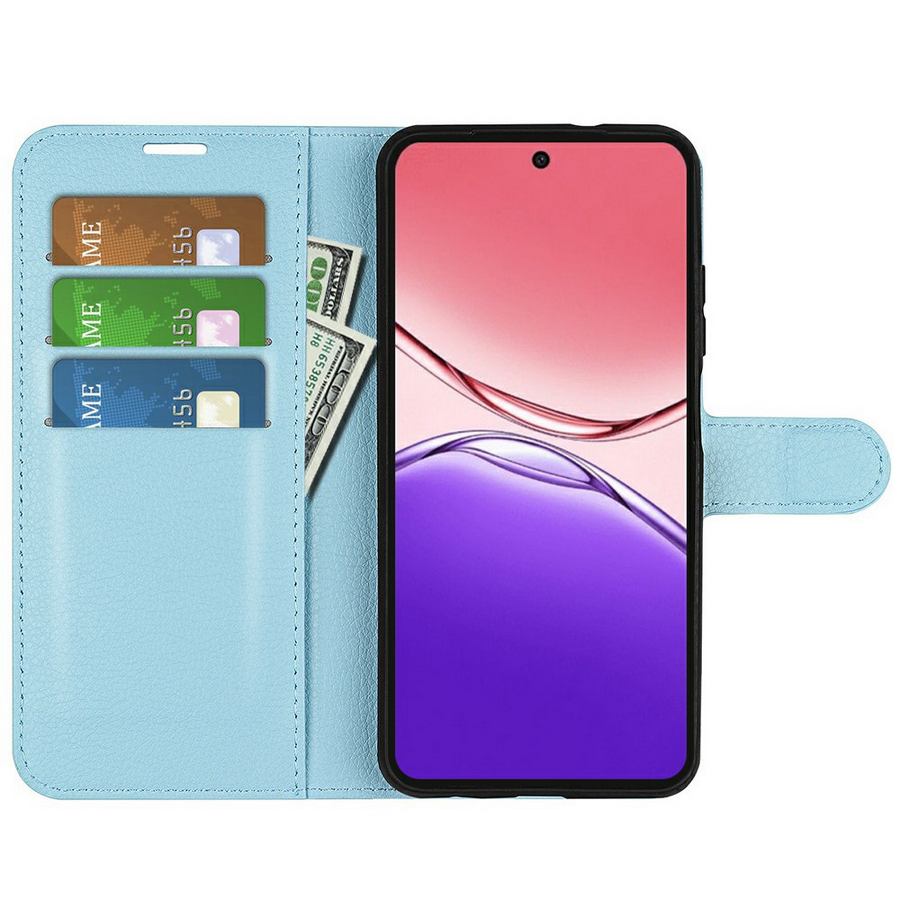 Käytännöllinen, lompakkomallinen kotelo vaaleasävyisen sinisillä kansilla suojaa pätevästi Oppo A5 Pro 5G -älypuhelimen osumilta.