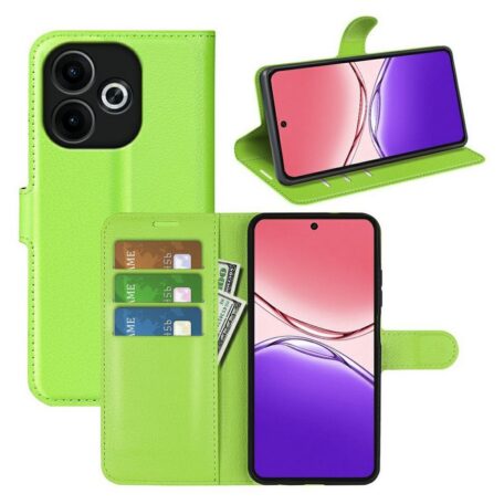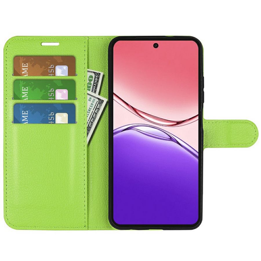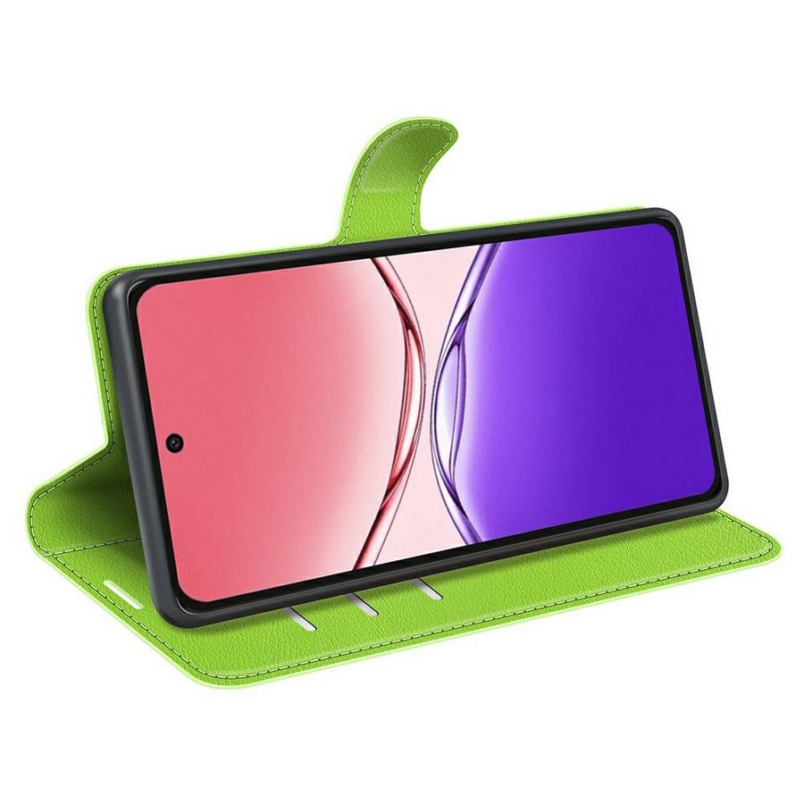 Ihanan pirteä, kirkkaan sävyisen vihreä lompakkokotelo on Oppo A5 Pro 5G -puhelimen napakka ja käytännöllinen suoja.