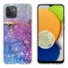 Sinisten sävyjen ja marmorikuvioidun pinnan leikkiä Samsung Galaxy A03 puhelinta suojaavassa takakuoressa.