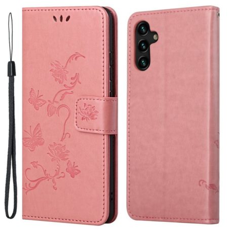 Samsung Galaxy A04s puhelimen suojaksi mitä ihanin vaaleanpunainen kotelo, jonka kansia somistavat perhoset ja kukat.