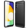 Hyvännäköinen musta takakuori suojaamaan Samsung Galaxy A04s puhelinta, hiilikuitua ja harjattua pintaa kuvioinnissa.