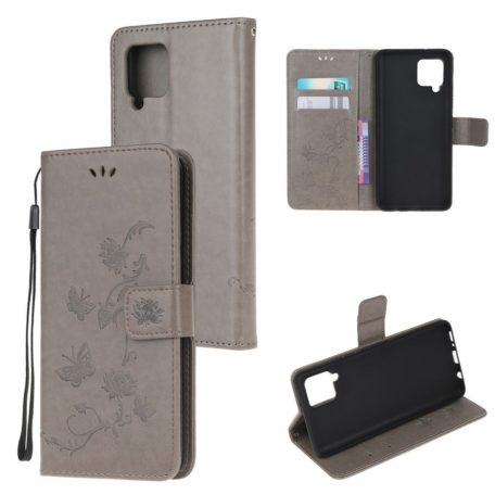 Hillityn harmaaseen koteloon tuo ilmettä perhosin ja kukkasin painetut kuvioinnit, suojaava tuote Samsung Galaxy A12 puhelimelle.