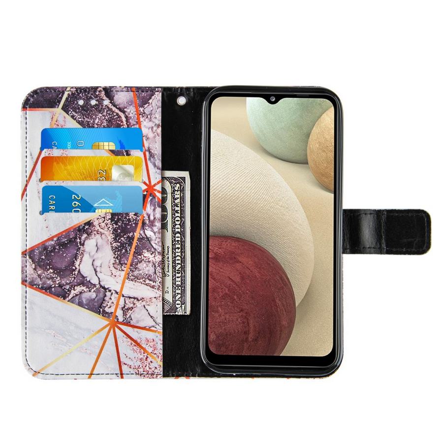 Vaaleat ja tummat marmoripinnat vuorottelevat graafisten kuvioiden koristamissa kansissa, kotelo jolla suojaat Samsung Galaxy A12 puhelimen.